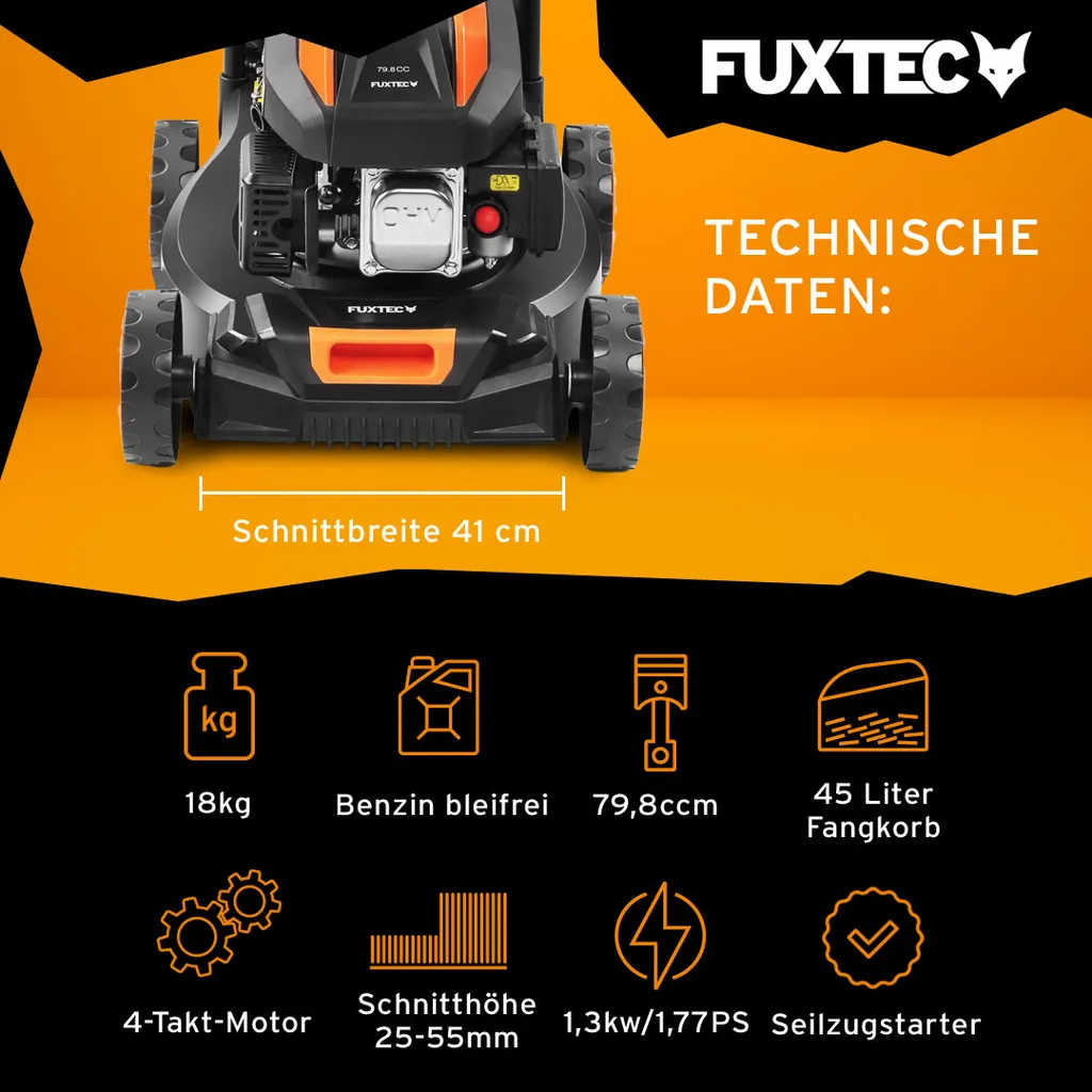 Benzin Rasenmäher | Kompaktmäher | 410mm Schnittbreite | 80ccm | 18kg | 45L | Ultraleicht, Kompakt | Bis 400m² | FX-RM4180 | FUXTEC