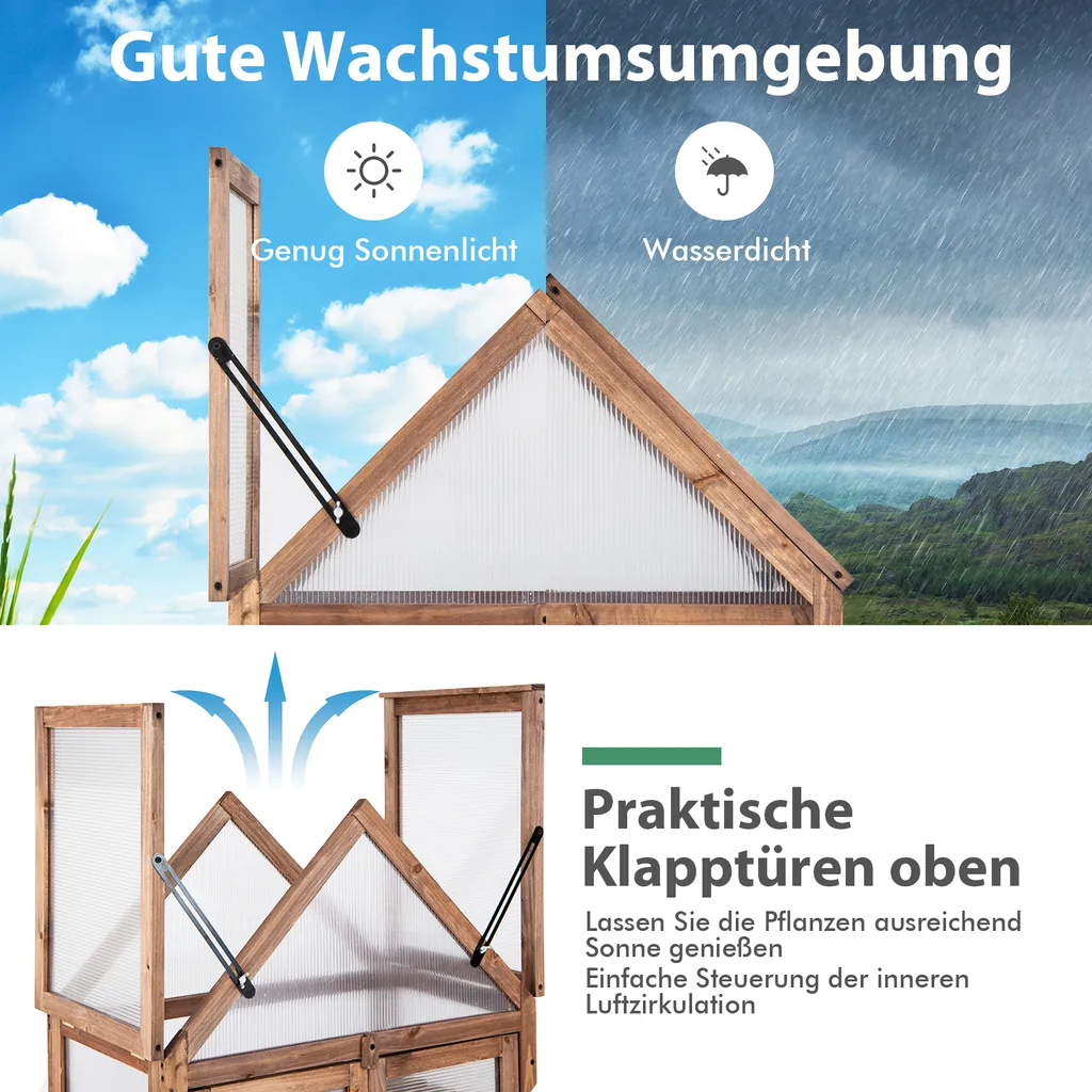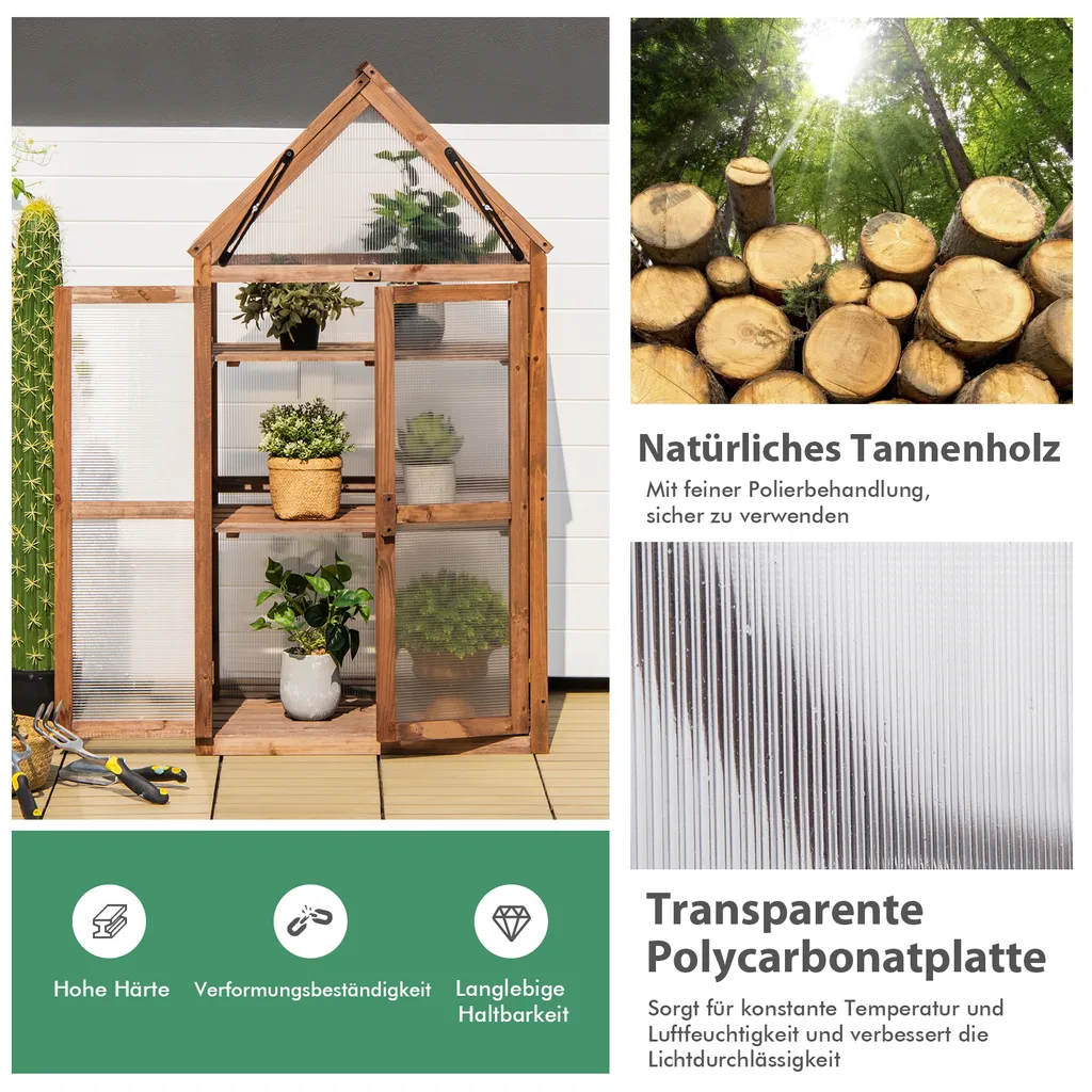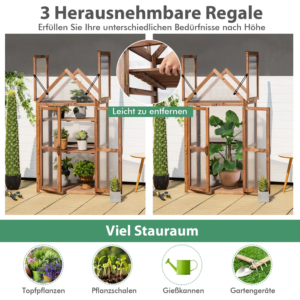 COSTWAY Frühbeet Mini Gewächshaus, 3-stöckiges Pflanzenbeet Mit Aufklappbarem Dach, Anzuchthaus Mit 2 Türen, Treibhaus, Aufzuchtschrank Für Balkon Garten, Braun, 71x41x133cm