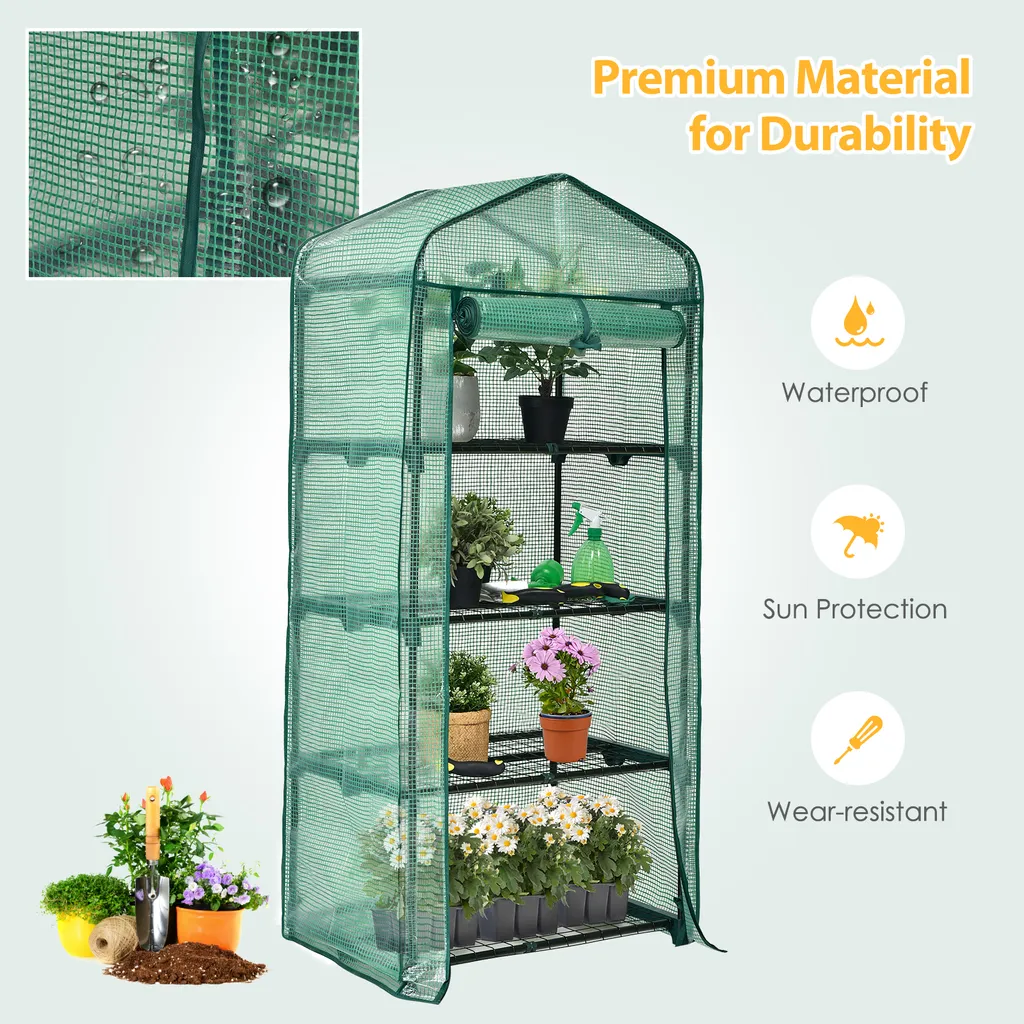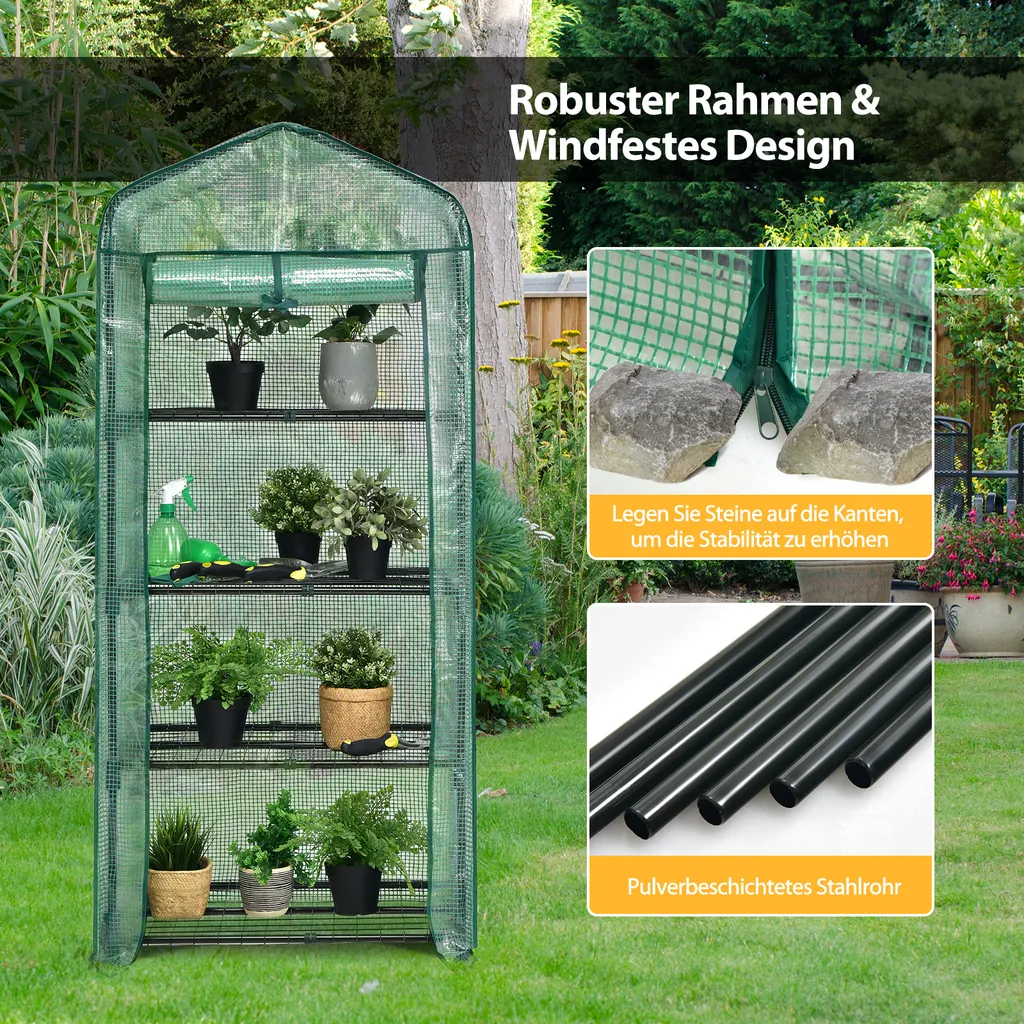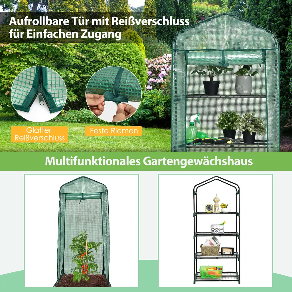 COSTWAY Mini Gewächshaus Mit 4 Etagen, Foliengewächshaus Winterfest, PVC Gewächshausabdeckung, Anzuchthaus Mit Reißverschluss, Gartenhaus Für Garten Balkon Outdoor (70x49x159cm, Grün)