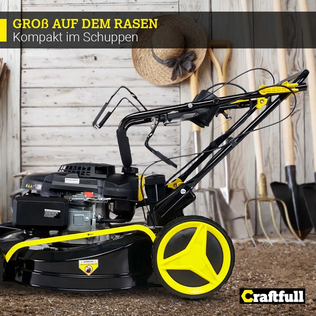 Craftfull Benzinrasenmäher CR-196-10E, 53 Cm Schnittbreite, Benzin Rasenmäher Mit Radantrieb Inkl. Elektrostarter & Rasenkamm, 196 Cc, 4,4 KW / 6PS, Euro 5 Norm, 5in1, Marken Motor, GT-Markengetriebe, 8 Stufen Höhenverstellbar, 62 Liter Fangsack, Easy-Clean-Funktion