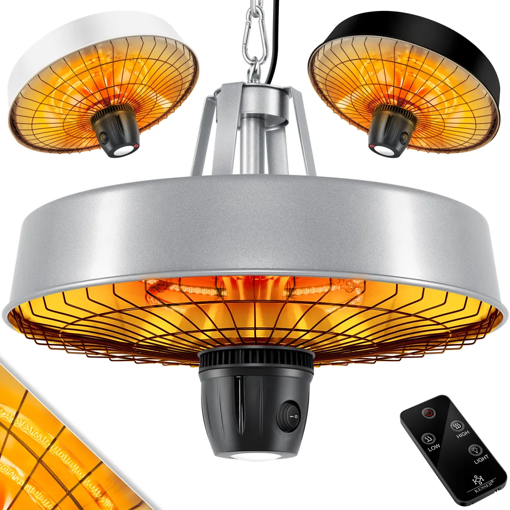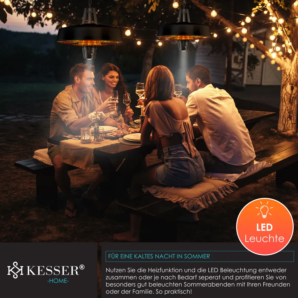 KESSER® Deckenheizstrahler Heizpilz Infrarot-Heizstrahler 2500W Terrassenstrahler Mit Fernbedienung Quarzstrahler | LED Licht | Decke | Infrarotstrahler | Mit Kette + Karabinerhaken Carbon-Heizelement, Farbe:Schwarz