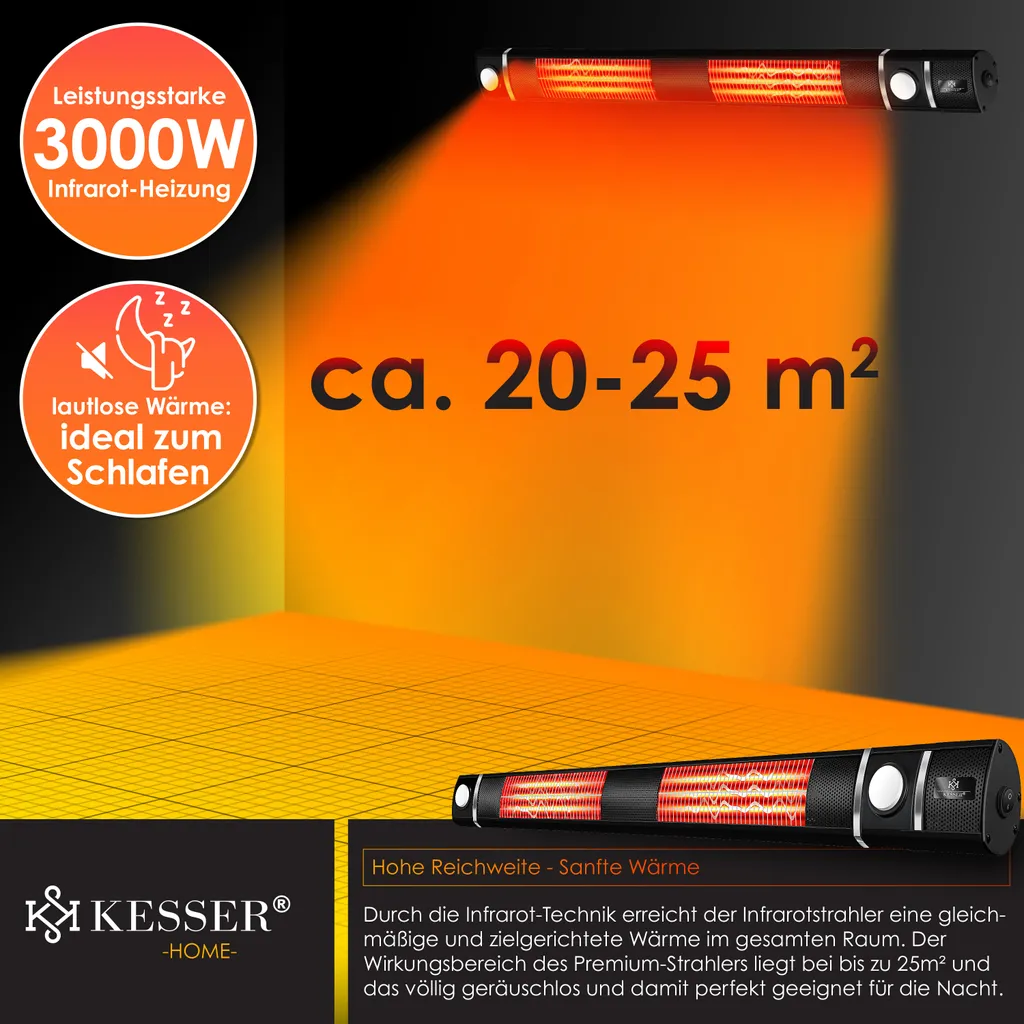 KESSER® Infrarot Heizstrahler 3000W IR-Gastro-Bar Inkl. LED Licht Terrassenstrahler Mit WiFi & Fernbedienung Inkl. Schutzhülle Infrarotstrahler Quarzstrahler Terrassenheizer Wand-Heizstrahler, Farbe:Schwarz