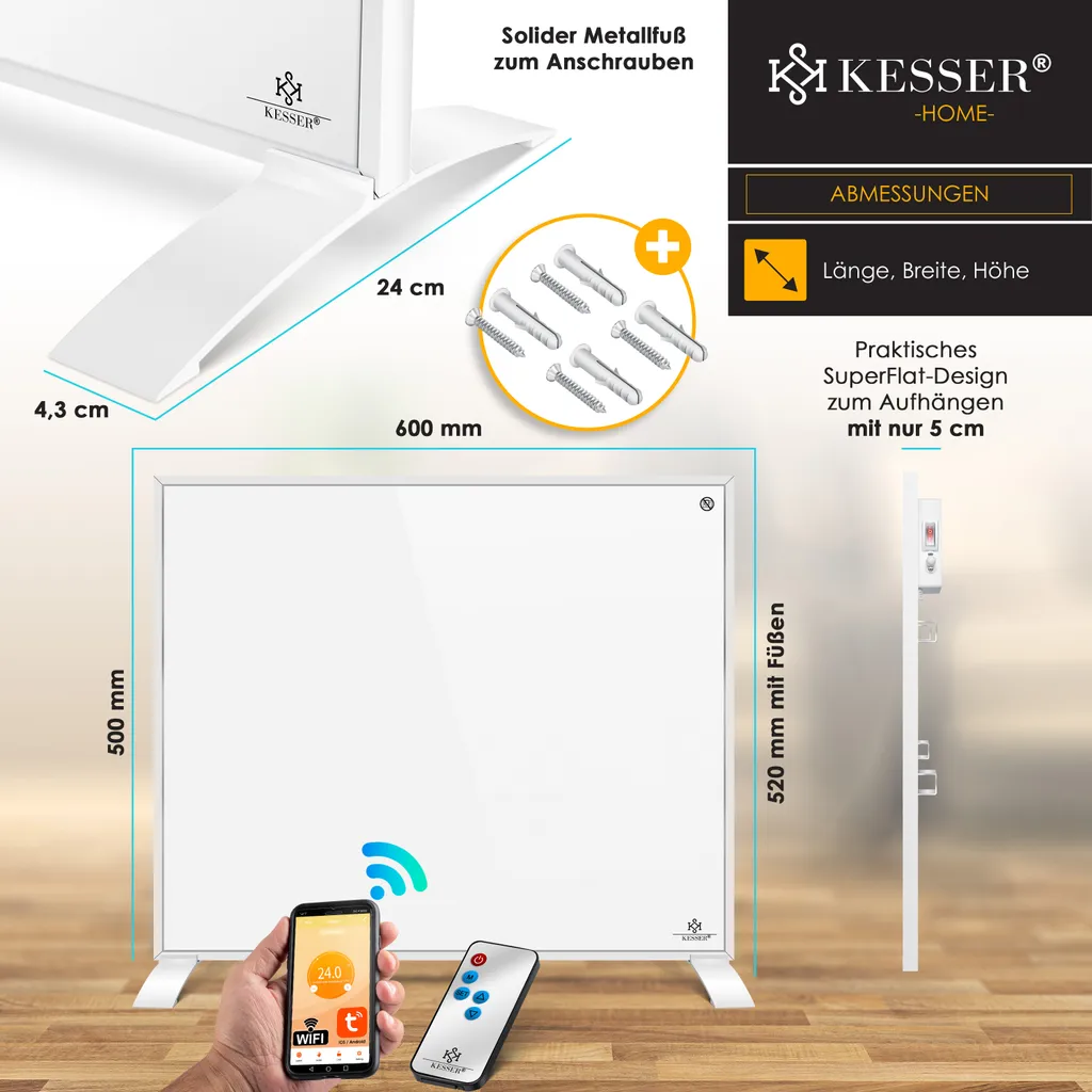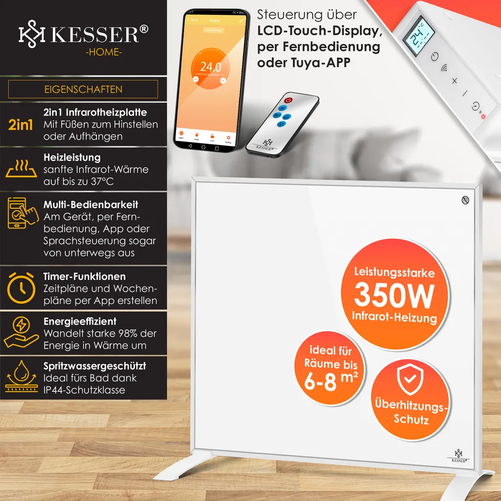 KESSER® Infrarotheizung Energiesparend Infrarot 2in1 Standgerät & Wandmontage Elektroheizung Mit Fernbedienung Thermostat & App-Steuerung Timer Elektrisch Heizpaneel Heizung Konvektor Standfüße, Farbe:Weiß, Größe:350W