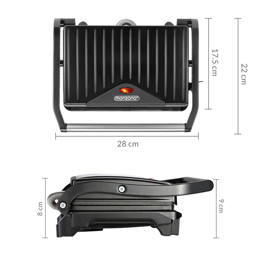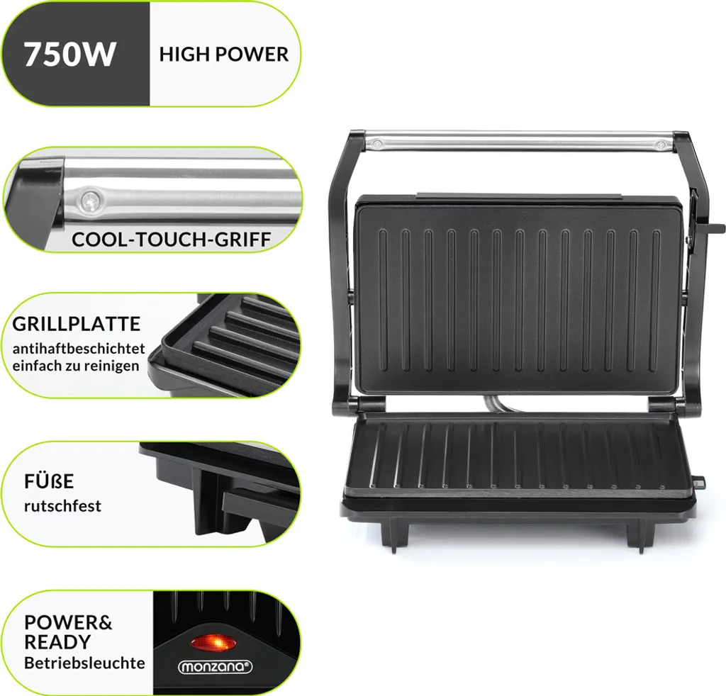 Monzana Kontaktgrill Antihaftbeschichtung BPA Frei Cool-Touch Griff Herausnehmbare Auffangschale 750W Tischgrill Sandwich Maker