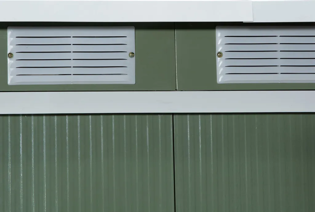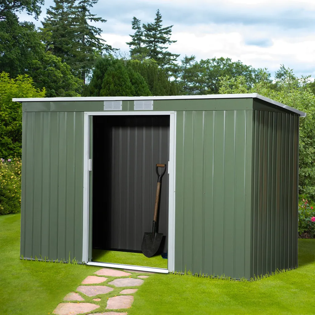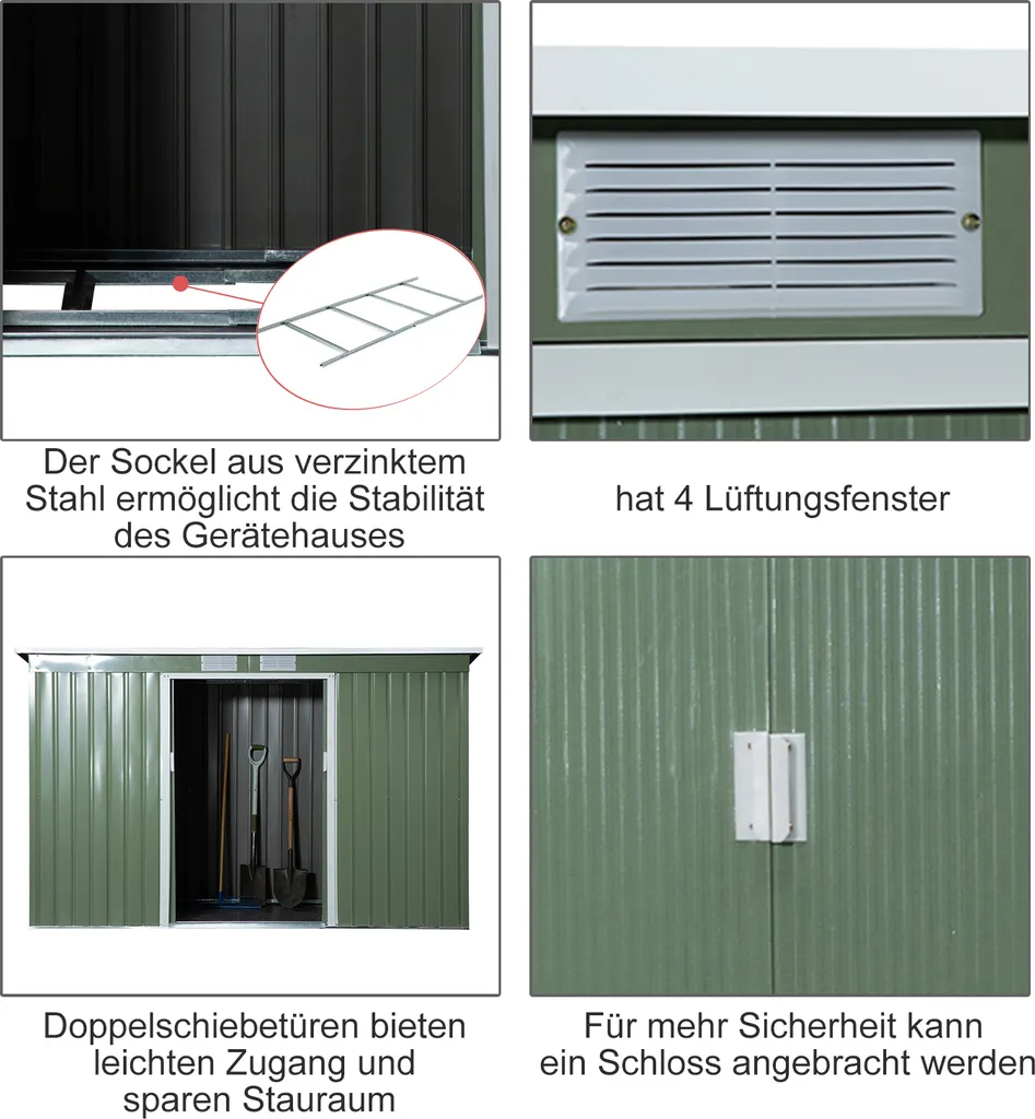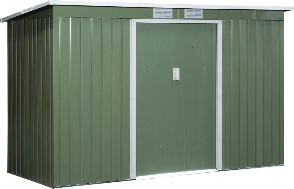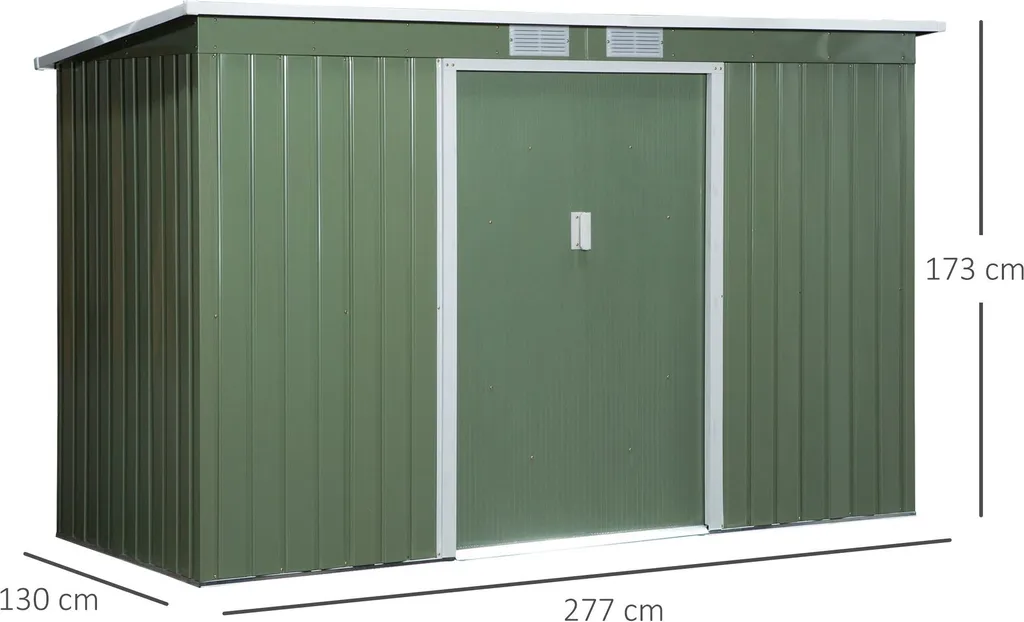 Outsunny Gerätehaus, Gartenhaus, Geräteschuppen Mit Schiebetür, Lüftungsfenster, Pultdach, Outdoor, Stahl, Hellgrün, 277 X 130 X 173 Cm