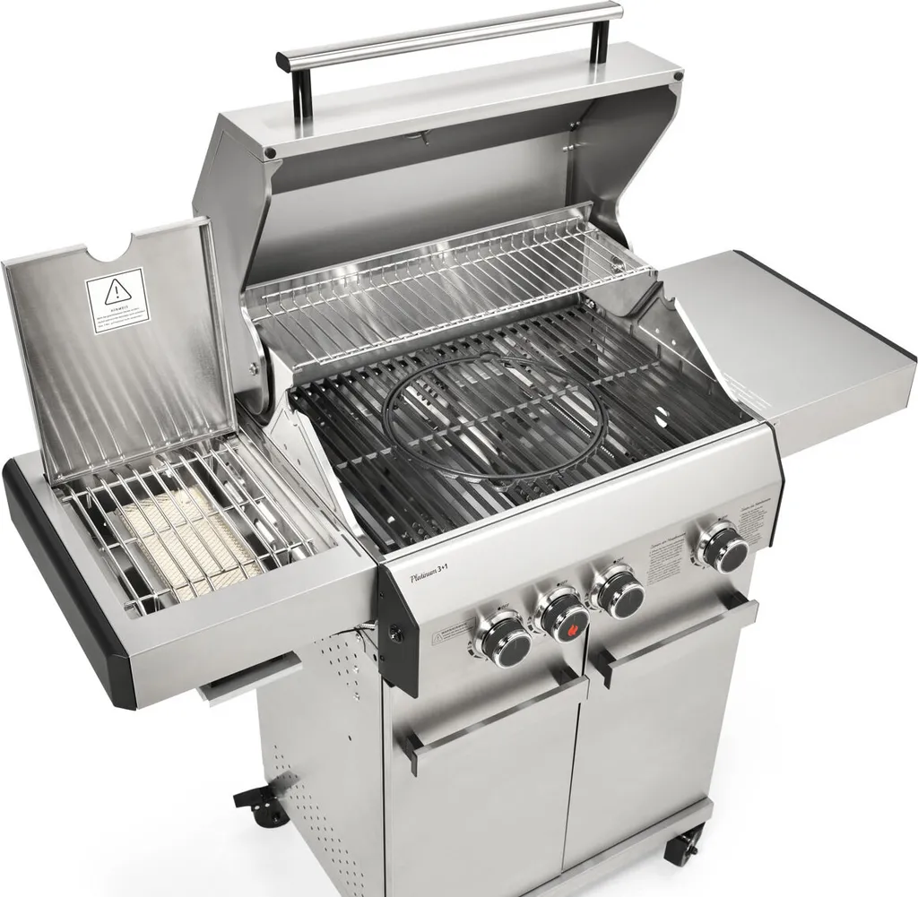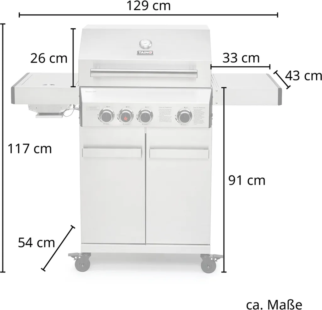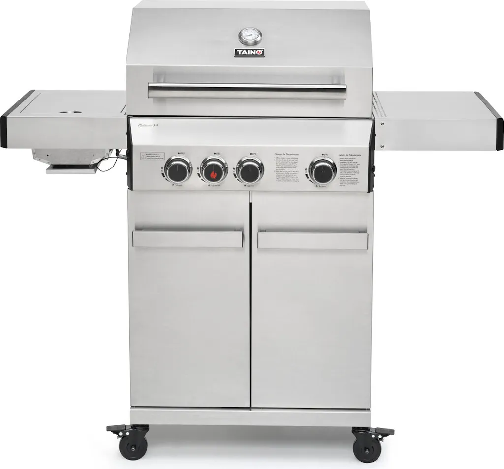 TAINO PLATINUM 3+1 Gasgrill Komplett Edelstahl 3-Brenner Silber Grillwagen BBQ Griller Piezozündung Seitenkocher Gusseisen-Roste Im Set Mit Zubehör