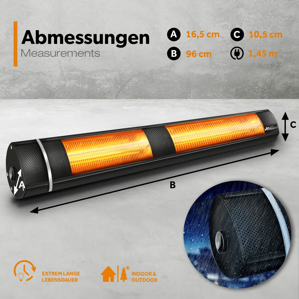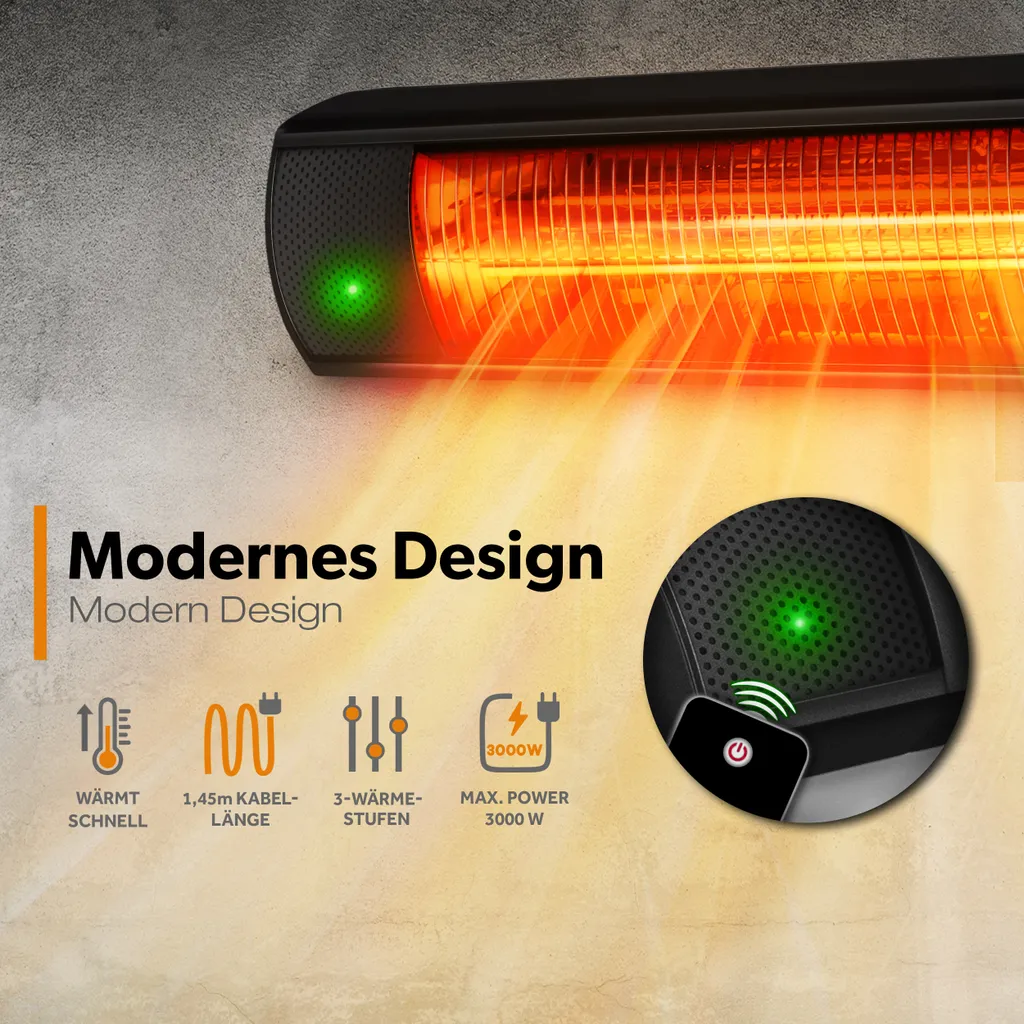 TRESKO Infrarot Heizstrahler 3000W Schwarz Mit Fernbedienung | Wärmestrahler Terrasse Elektrisch Mit 3 Heizstufen | Terrassenstrahler Innen & Außen | Wand-Heizstrahler Infrarotstrahler Quarzstrahler Wickeltischstrahler